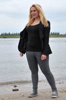 in grey legging pants, a blazer over a black longsleeve and sneakers.