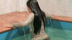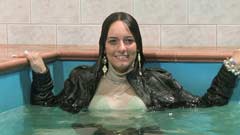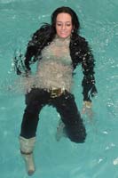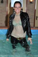 11:59 min. movie (1080p MP4, 619 Mb) and 425 images (199 Mb) of Annique in the pool in a leather jacket over a sweater, grey pants and boots with open toes, without socks.