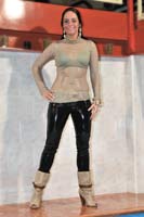She takes a shower afterwards, partly wearing her boots and jacket again.