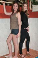 Helen in a top, shorts and shoes, Elise in a longsleeve, skirt, shiny leggings and sandals with heels.