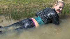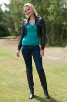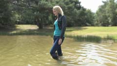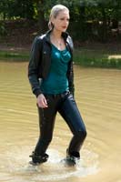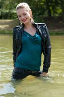 137 and 158 images (183 Mb) of Sin in a lake in a short leather jacket over a green top, tight jeans, high boots and socks.