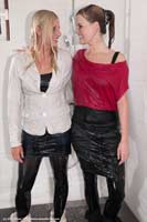 Diane in a white blazer, denim skirt, tights and boots, Melissa in a shirt, skirt, leggings, boots and socks.