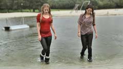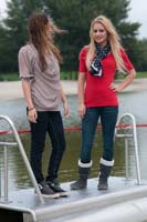 Nina in a red tshirt, jeans, boots and socks, Melissa in a shirt, jeans, sports shoes and socks.