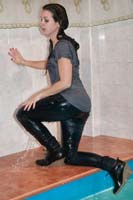 She takes a shower afterwards (only in one of the photosets), partly with and without her blazer, and she finally takes her shoes off.