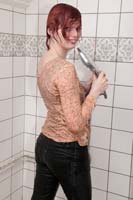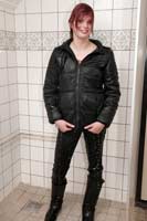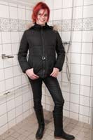207 images (83 Mb) of Nathalie taking a shower in a wintercoat over a longsleeve over a top, black jeans, boots and red socks.
