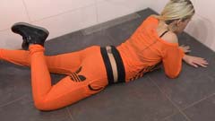 of Jennifer taking a shower in a very orange jogging suit, sports shoes and socks.