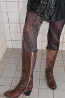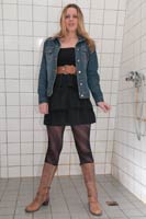 190 images of Larissa taking a shower in a denim jacket over a black dress, pantyhose and boots.
