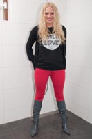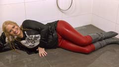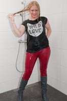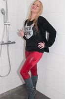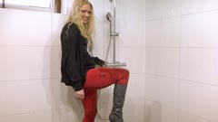 taking a shower in a cardigan over a tshirt, tight red pants, grey boots and black socks.