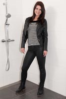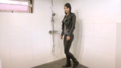 8:18 min. movie (1080p MP4, 430 Mb) and 119 images (42 Mb) of Mary in the shower in a leather jacket over a longsleeve, leather pants and black shoes.