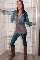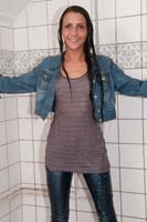 176 images (75 Mb) of Merel in the shower in a short denim jacket over a purple top, jeans, boots and dark socks.