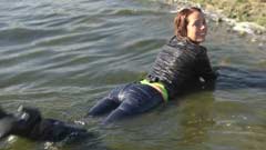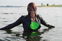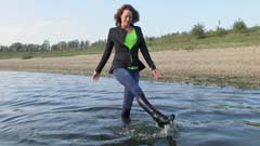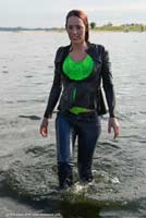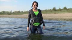 255 and 97 images (199 Mb) of Merlin taking a sunset swim in a lake in a black blazer over a bright green shirt, tight jeans, boots and socks.