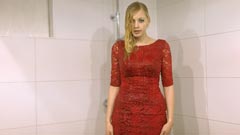 in the shower in a red dress, pantyhose and boots.