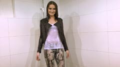 taking a shower in a short jacket over a white top, tight snake-print pants, boots and dark socks.