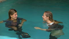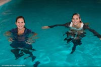 taking an outdoor shower, followed by a swim in an indoor pool in dresses and pantyhose,