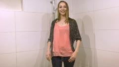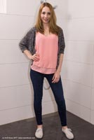 in the shower in jeans, a cardigan over a pink top and simple sneakers (no socks).