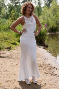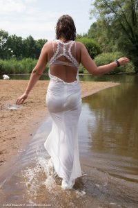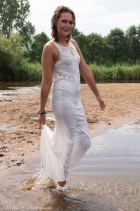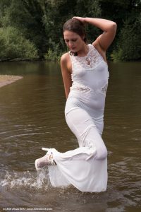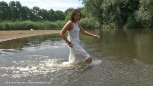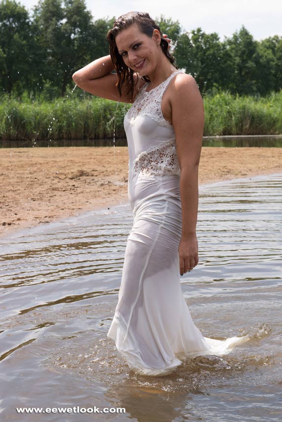 of Sin in a lake, wearing a long party dress and sandals with heels.