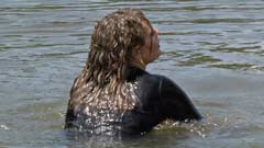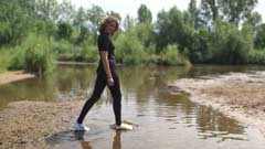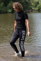 in a lake in tight sports pants, a short-sleeved sweater and white sports shoes.