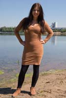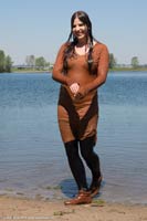 in a lake in a dress, legging pants and brown shoes.