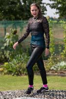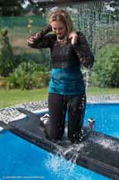 in an outdoor pool in tight black pants, a transparent shirt over a blue top and sports shoes.