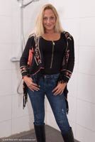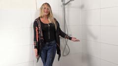 taking a shower in jeans, a cardigan over a black top and rubber boots.