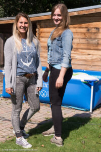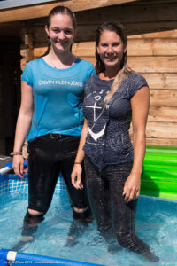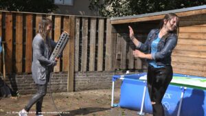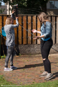 of Ella and Eline playing with a sprinkler and in a small pool in the backyard.
