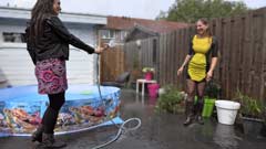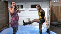 They first play with a waterhose, then they lay down in a kiddiepool, where they take their boots off.