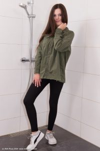 of Samirah taking a shower in legging pants, a shirt and sports shoes.