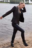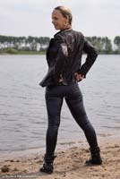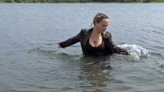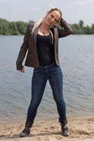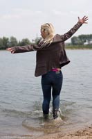 of Kyra in a lake in jeans, a blazer over a top and small boots.
