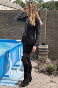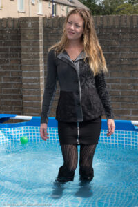 of Leah Gabrielle in a small pool, wearing a skirt, a jacket over a (partly transparent) shirt, pantyhose and boots.