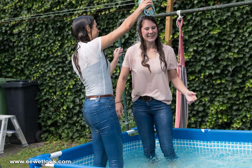taking an outdoor shower in the garden, then take a bath in a small pool,