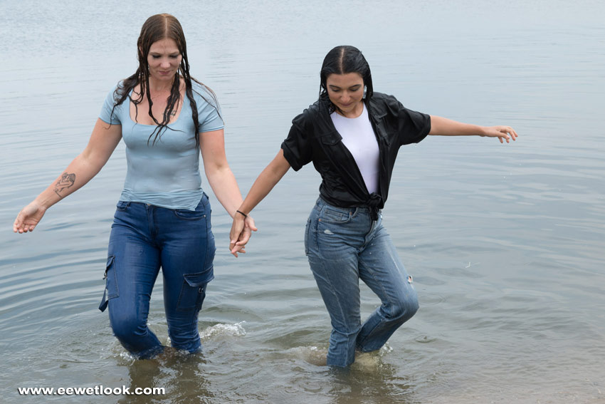 in a lake wearing jeans and tshirts, Sharon with flats, Valentina with a black blouse and sports shoes.