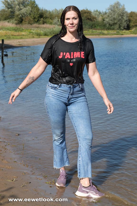 in a lake wearing jeans, a tshirt and sports shoes.