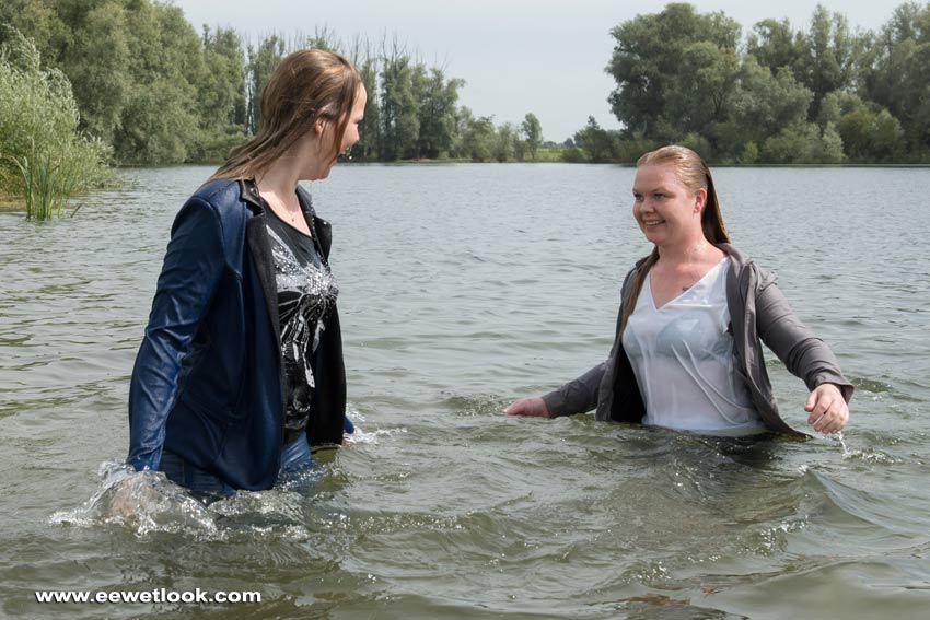 in a lake wearing jeans, blazers and shirts, Lotje with sneakers, Charlotte with black leather shoes with laces.