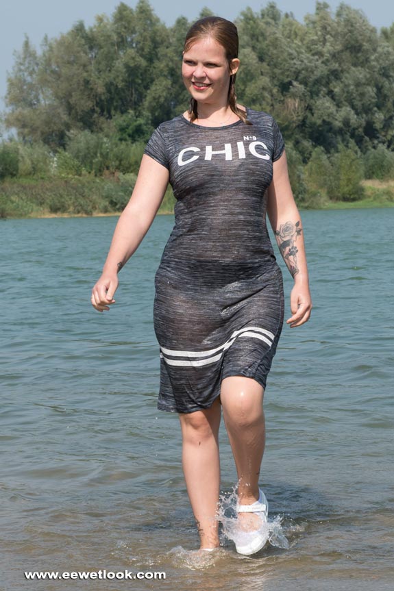 of Lotje in a lake on a windy day, wearing a dress, pantyhose and shoes.